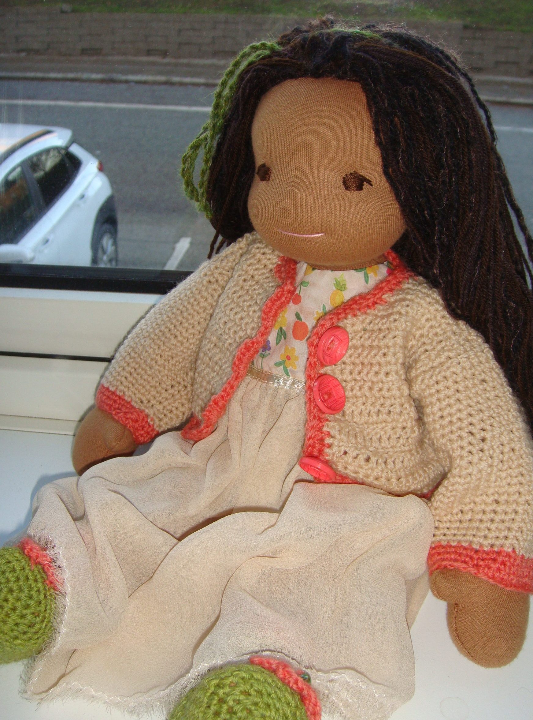 Wanda Lise Sofie Garde Ikke kategoriseret 27. december 20254. januar 2026 Wanda, en mulat lille dukke med brune øjne. Hun har her sin kjole med ren silke nederdel i laksefarvet. Med følger et hæklet jakke, små hæklede støvler med blomster på, og strikkede underbukser Relateret