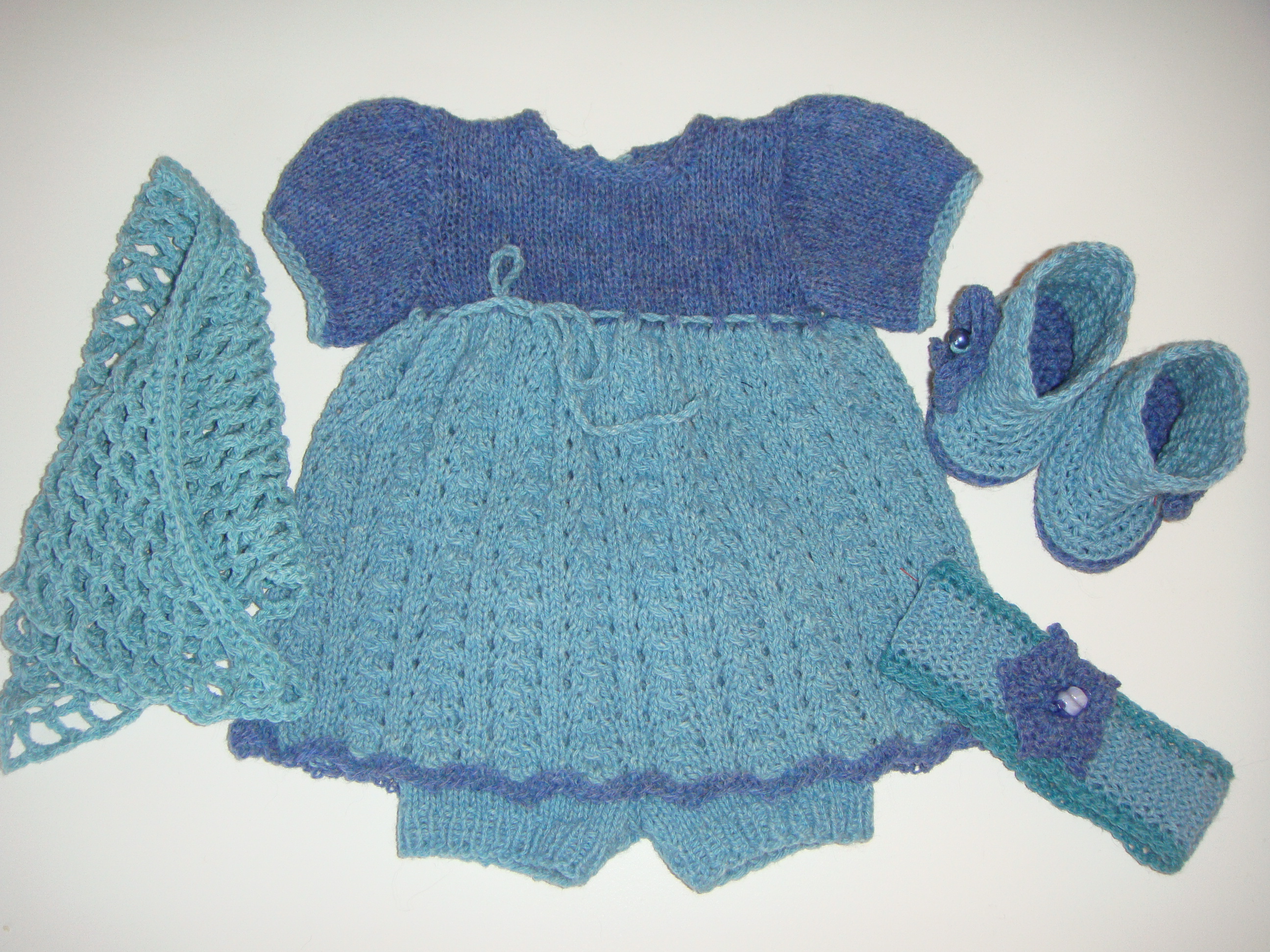 Kjolesæt vinterudsalg 50% Lise Sofie Garde Dukketøj, Str. 42 cm 31. december 202527. februar 2026 Kjolesæt bestående af kjole strikket i ren uld og med nederdel i hulmønsterstrik. Støvlerne er hæklede med sløjfe i siden. Med følger hæklet sjal, strikket pandebånd og strikkede underbukser. Alt i blålige nuancer Relateret