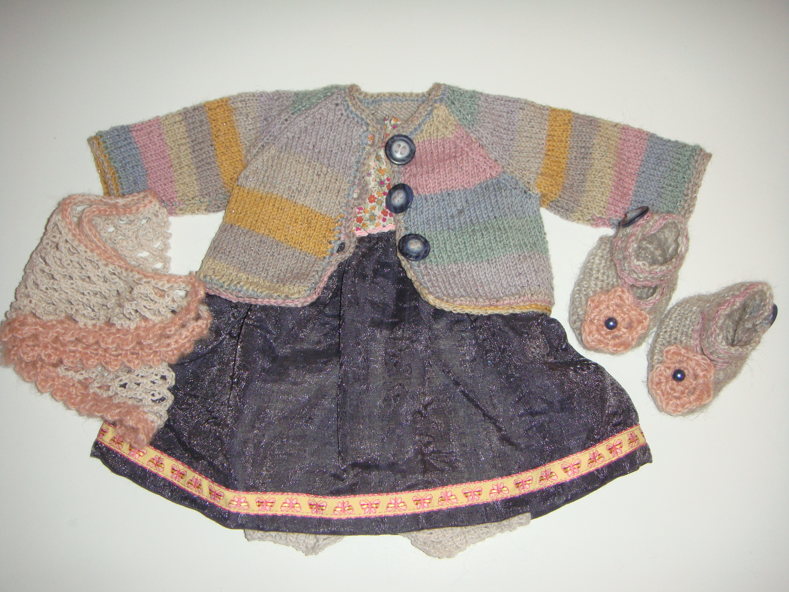 Kjolesæt Lise Sofie Garde Dukketøj, Str. 46 cm 2. januar 20265. januar 2026 Kjolesæt bestående af kjole, hvor nederdelsstoffet er syet af en rest fra Århus teater med en “sølveffekt”, cardiganen er strikket i uld med en lille glimmertråd i. Skoene er hæklet i mohair, sjal og hotpants er strikket en en blød beige uld. Relateret