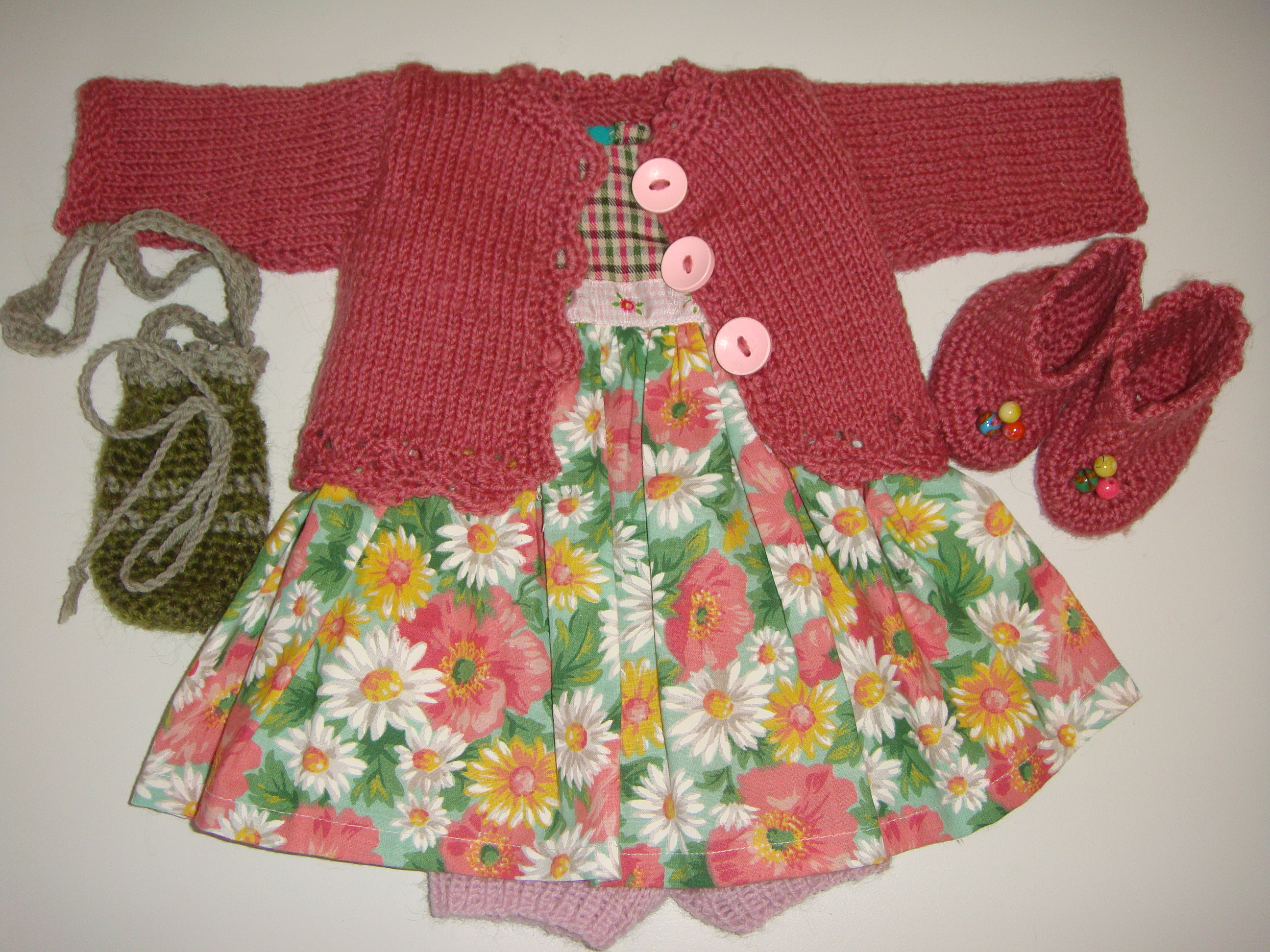 Kjolesæt Lise Sofie Garde Dukketøj, Str. 46 cm 2. januar 20262. januar 2026 Bomuldskjole med blomstret nederdel og ternet overdel i rosa/ grønne toner. Med følger en gammelrosa strikket uldtrøje med hulmønster forneden samt hæklede små støvler, lille posetaske og strikkede rosa hotpants Relateret