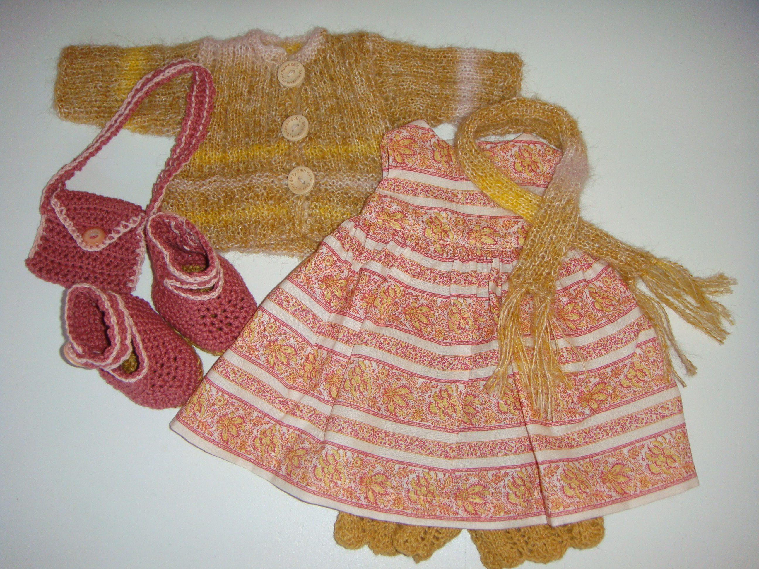 Kjolesæt tilbud Lise Sofie Garde Ikke kategoriseret 4. januar 202627. januar 2026 Kjolesæt bestående af rosa øko bomuldskjole og en cardigan strikket i silkmohair. Med følger strikkede trusser, hæklede sko, et strikket halstørklæde og en lille hæklet taske. Relateret