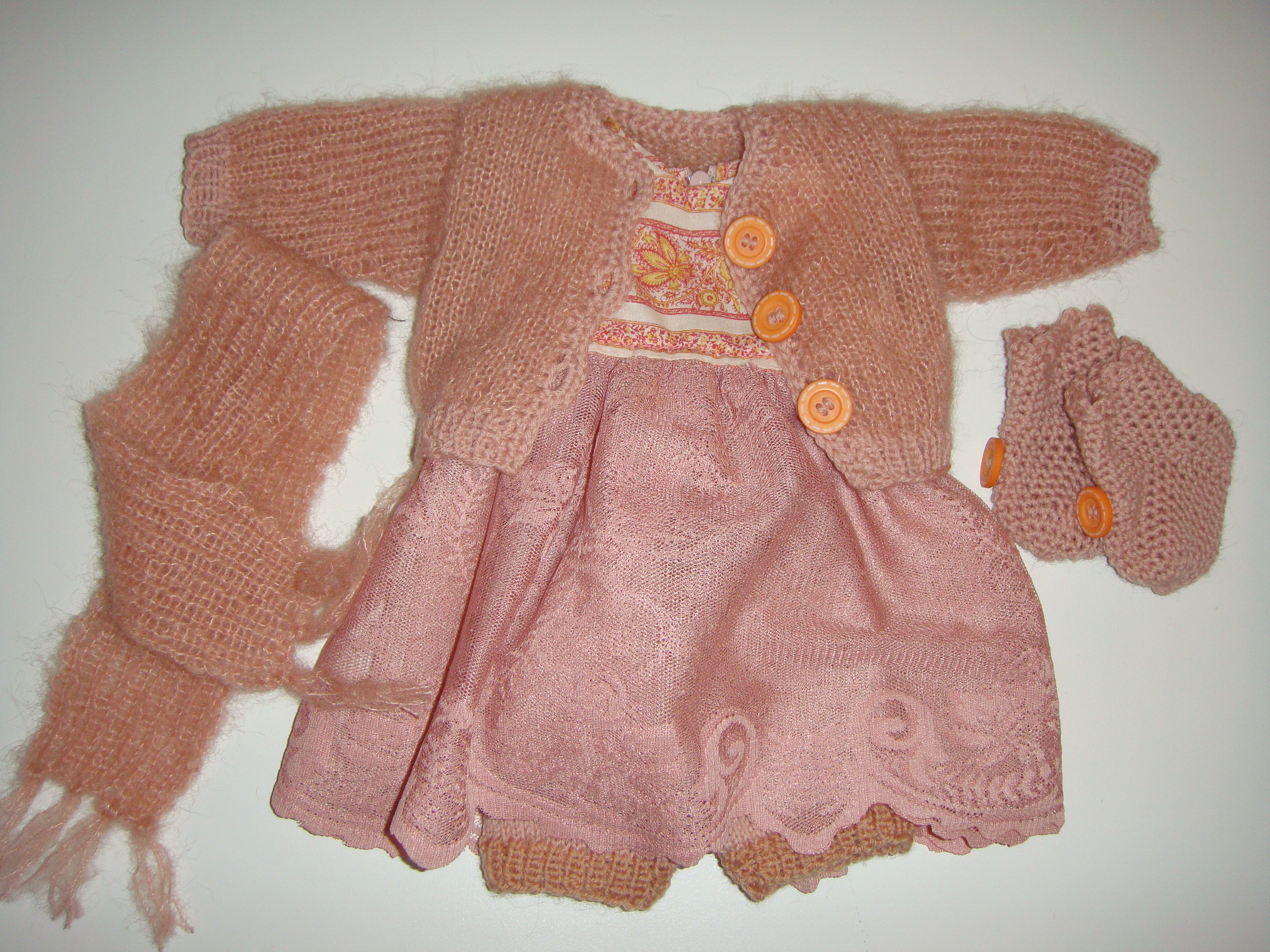 Kjolesæt Lise Sofie Garde Dukketøj, Str. 38 cm 8. januar 202610. januar 2026 Kjolesæt bestående af kjole med blondenederdel og lynlås i ryggen. Med følger gammelrosa “silk mohair” trøje, små hæklede sokker, et strikket halstørklæde og strikkede underbukser Relateret