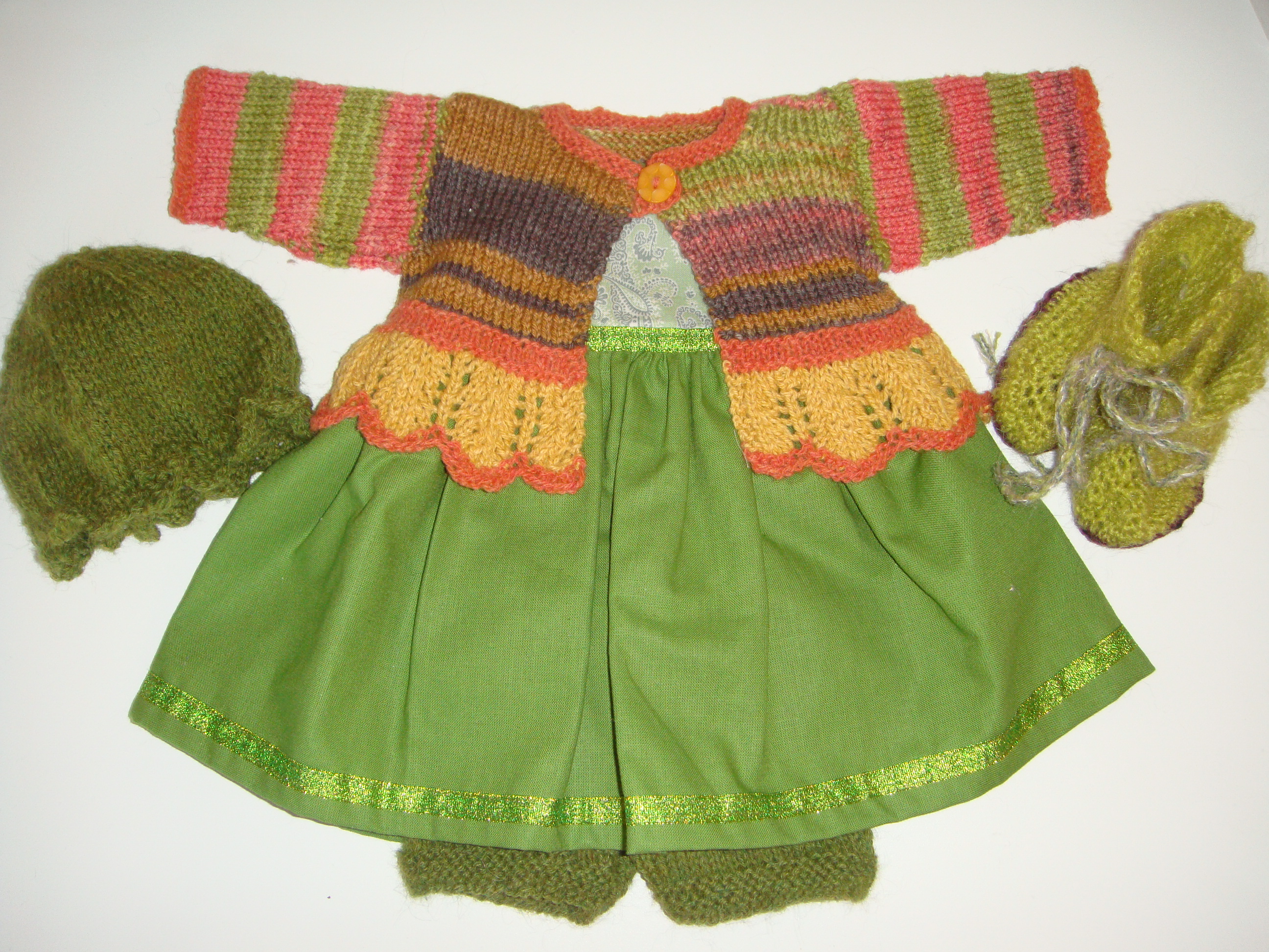 Kjolesæt bestående af kjole ned ærtegrøn nederdel og sart grøn overdel. Med følger en strikket cardigan i flerfarvestrik og bred blondekant, små hæklede sokker, en strikket hue og strikkede underbukser. Kjolen er kantet med en glimmergrønt bånd og har lynlås i ryggen
