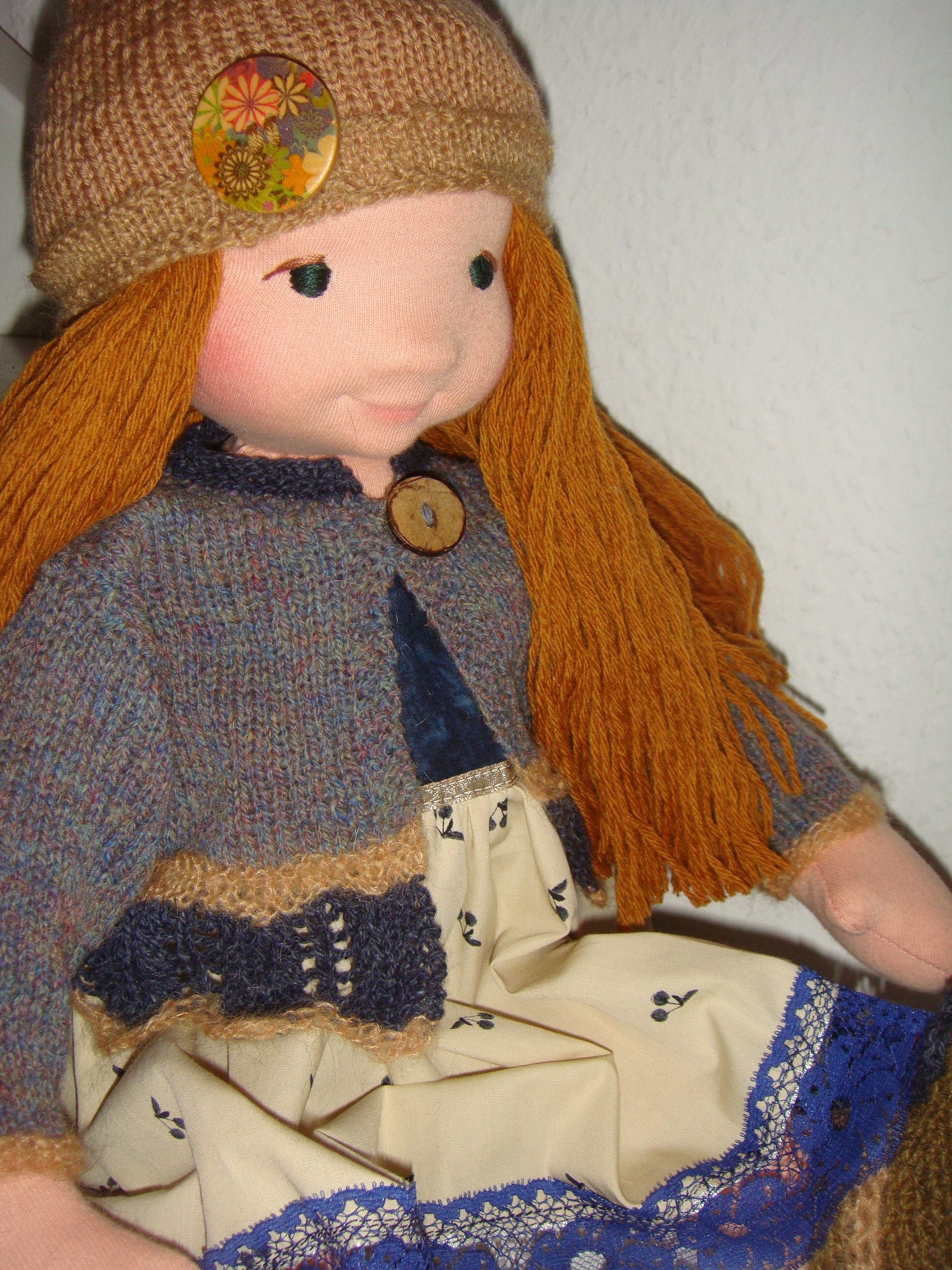 Nathalie Lise Sofie Garde Dukker til salg, Str. 46 cm 23. januar 202623. januar 2026 Nathalie med dybblå øjne og rødblond hår. Hun er i ført sin bomulds kjole med lys nederdel med blå blonde forneden, en cardigan strikket i Geilsk uld i blå nuancer, en strikket hue og hæklede støvler. Under kjolen har hun strikkede underbukser Relateret