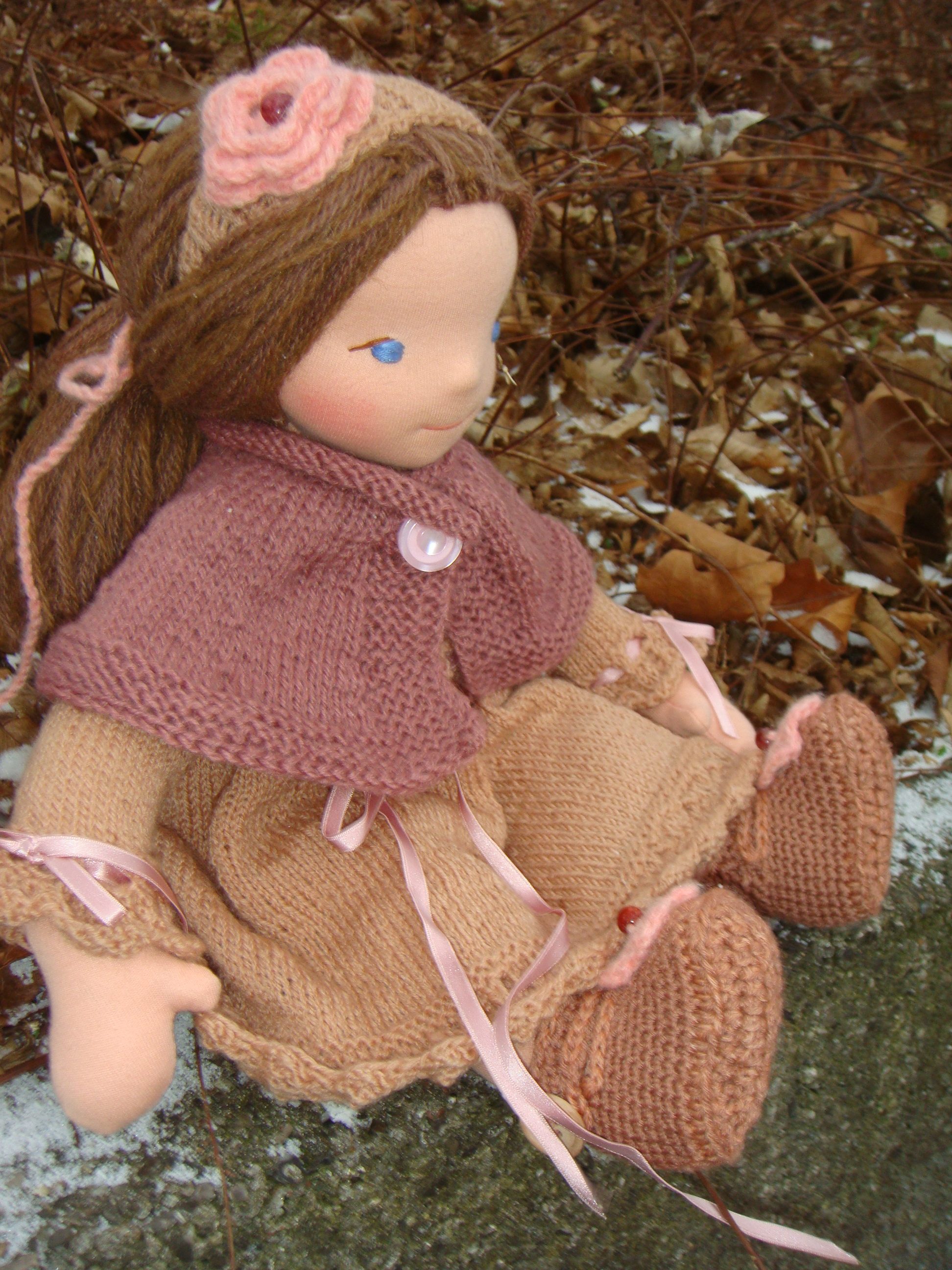 Elise med blå øjne og rødblond hår. Hun er i ført sin håndstrikkede kjole, strikket i alpakka og blondeborter i ærmer og forneden. Over sig har hun strikket kappe, på fødderne hæklede sko med lille blomst, i håret et strikket pandebånd også med blomst. Under kjolen har hun strikkede underbukser