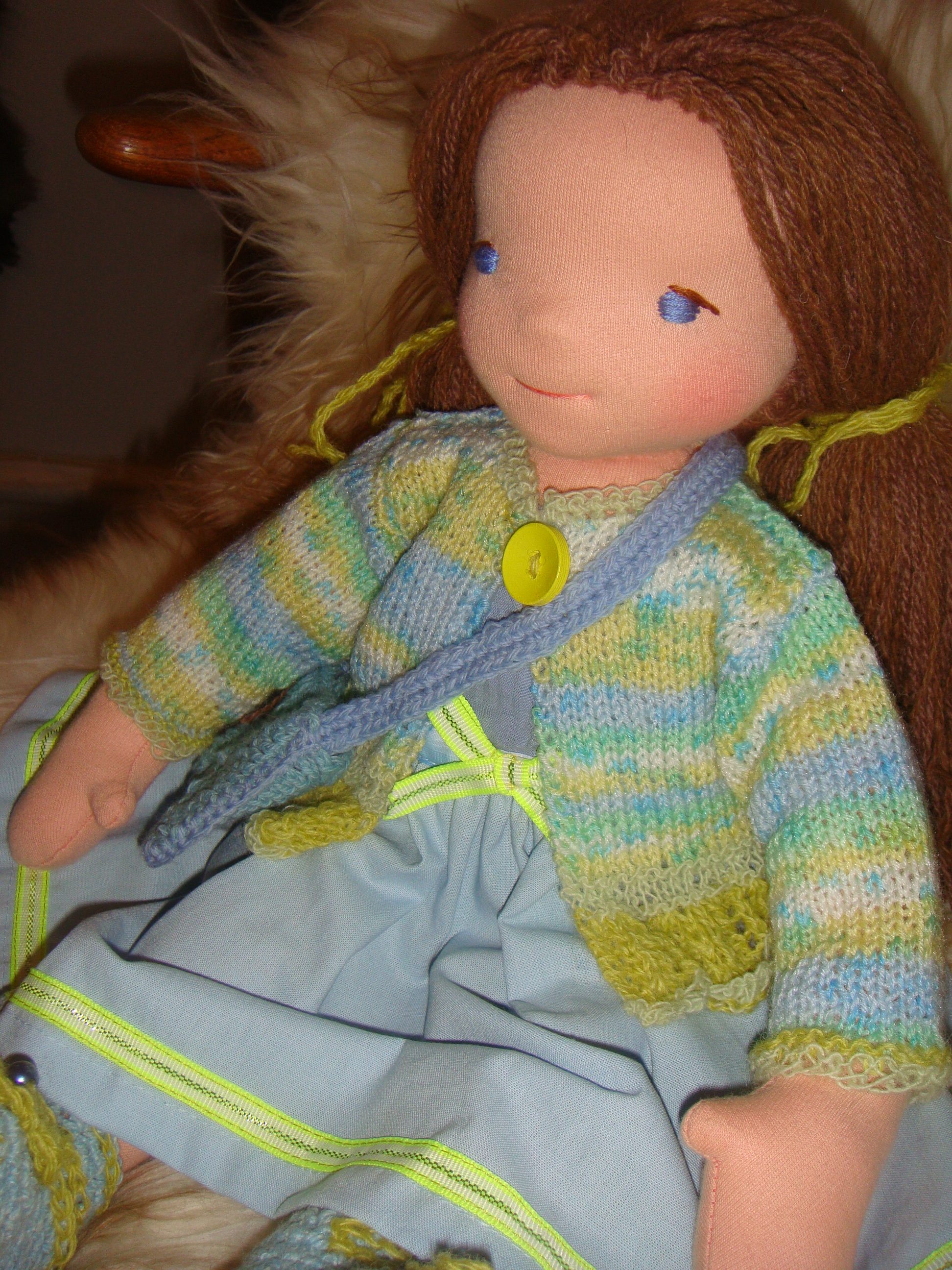 Elise med blå øjne og mellemblond hår. Hun har sin lys turkis kjole på syet i ren bomuld og med limegrønne kantebånd. Over sig har hun strikket cardigan strikket i limegrønne nuancer og med blondestrik forneden. Med følger en lille hæklet taske i Oldemorfirkant, hæklede sko med lille blomst og under kjolen strikkede underbukser