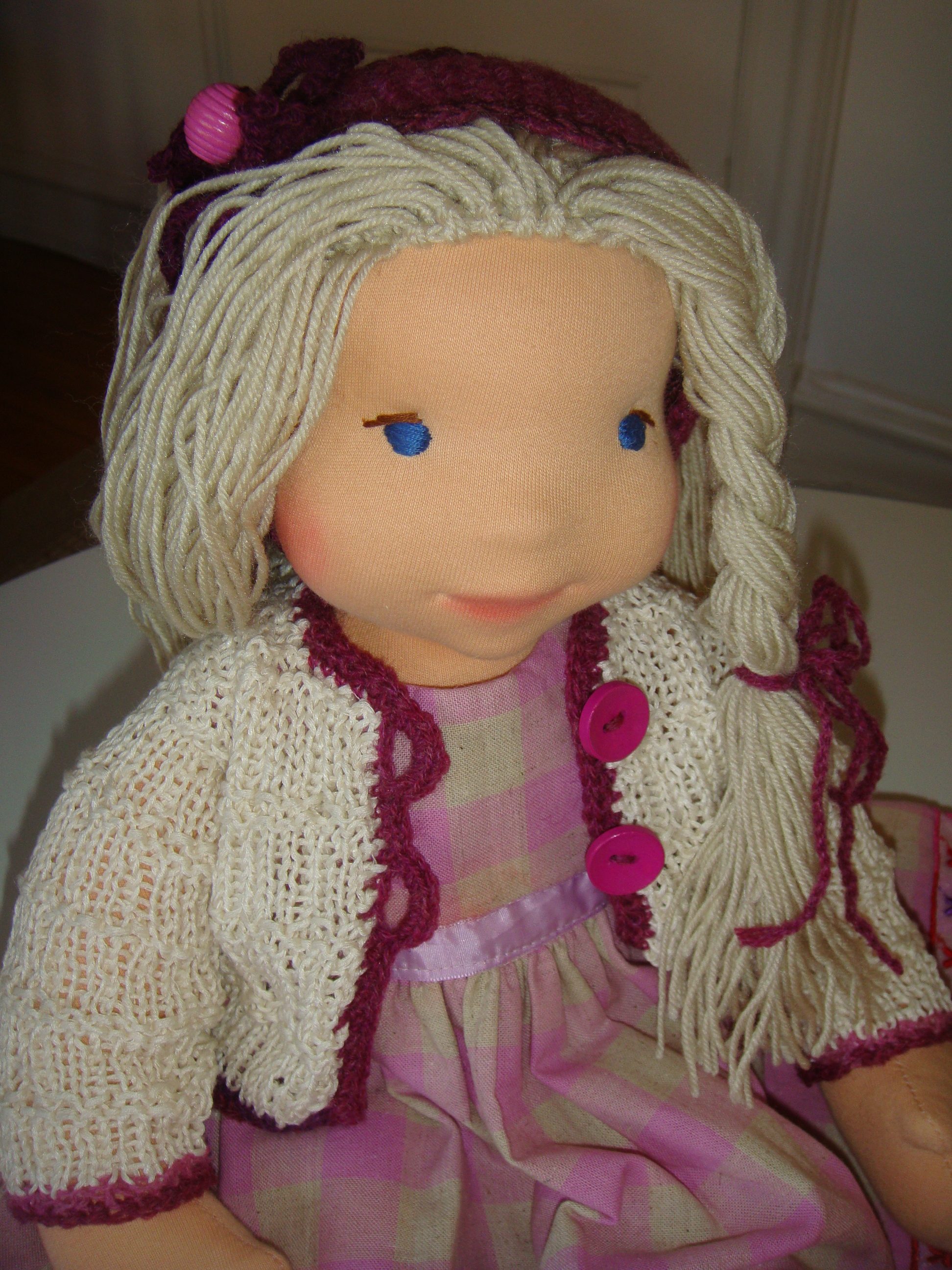 Dyveke med blå øjne og lyst hår. Hun er her iført sin ternede kjole syet i hør og bommuld i pink og råhvide tern. Over sig har hun en cardigan strikket i viskose, i håret har hun et hæklet pandebånd med blomst. På fødderne hæklede sko og under kjolen strikkede underbukser