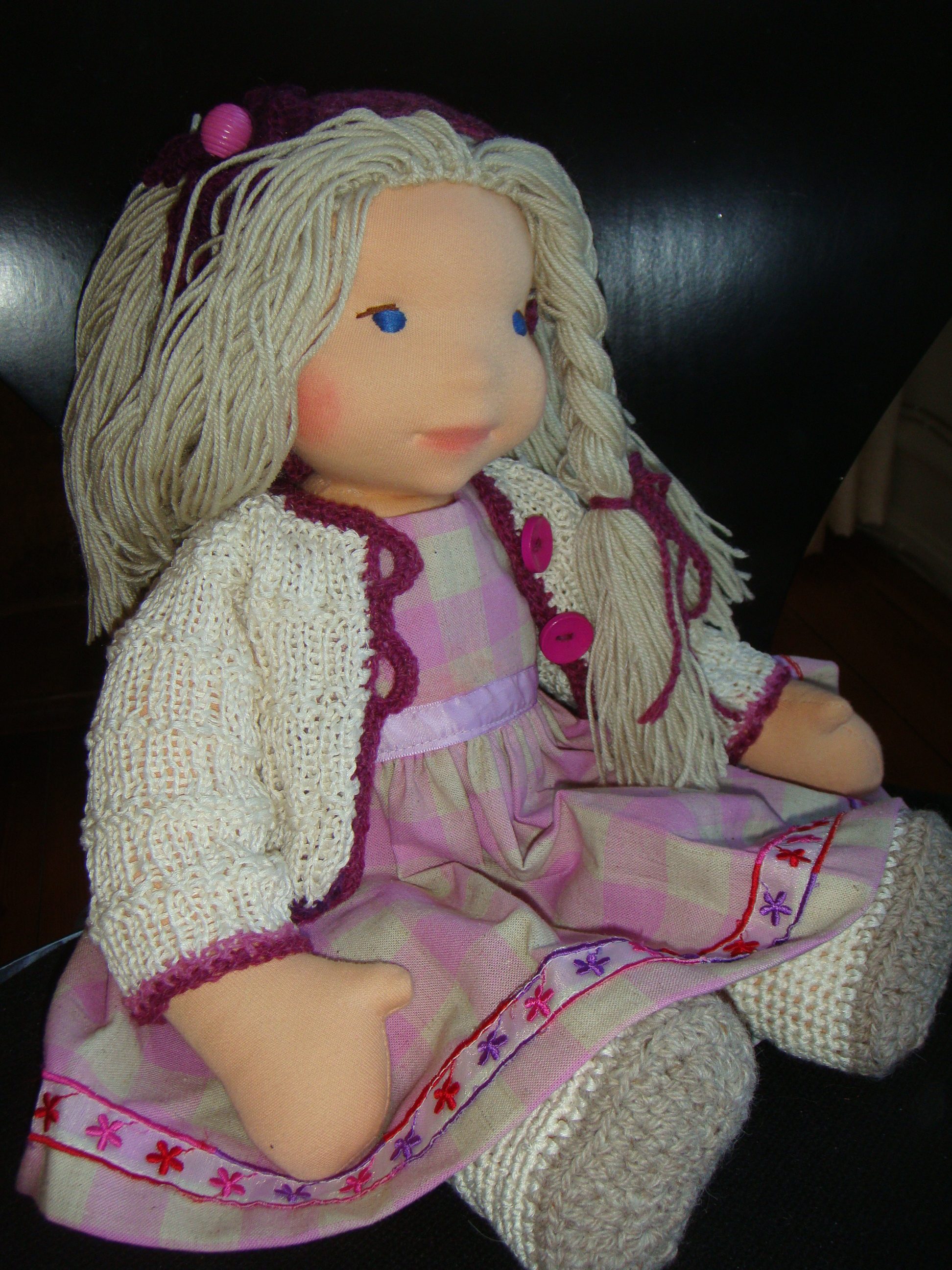 Dyveke med blå øjne og lyst hår. Hun er her iført sin ternede kjole syet i hør og bommuld i pink og råhvide tern. Over sig har hun en cardigan strikket i viskose, i håret har hun et hæklet pandebånd med blomst. På fødderne hæklede sko og under kjolen strikkede underbukser