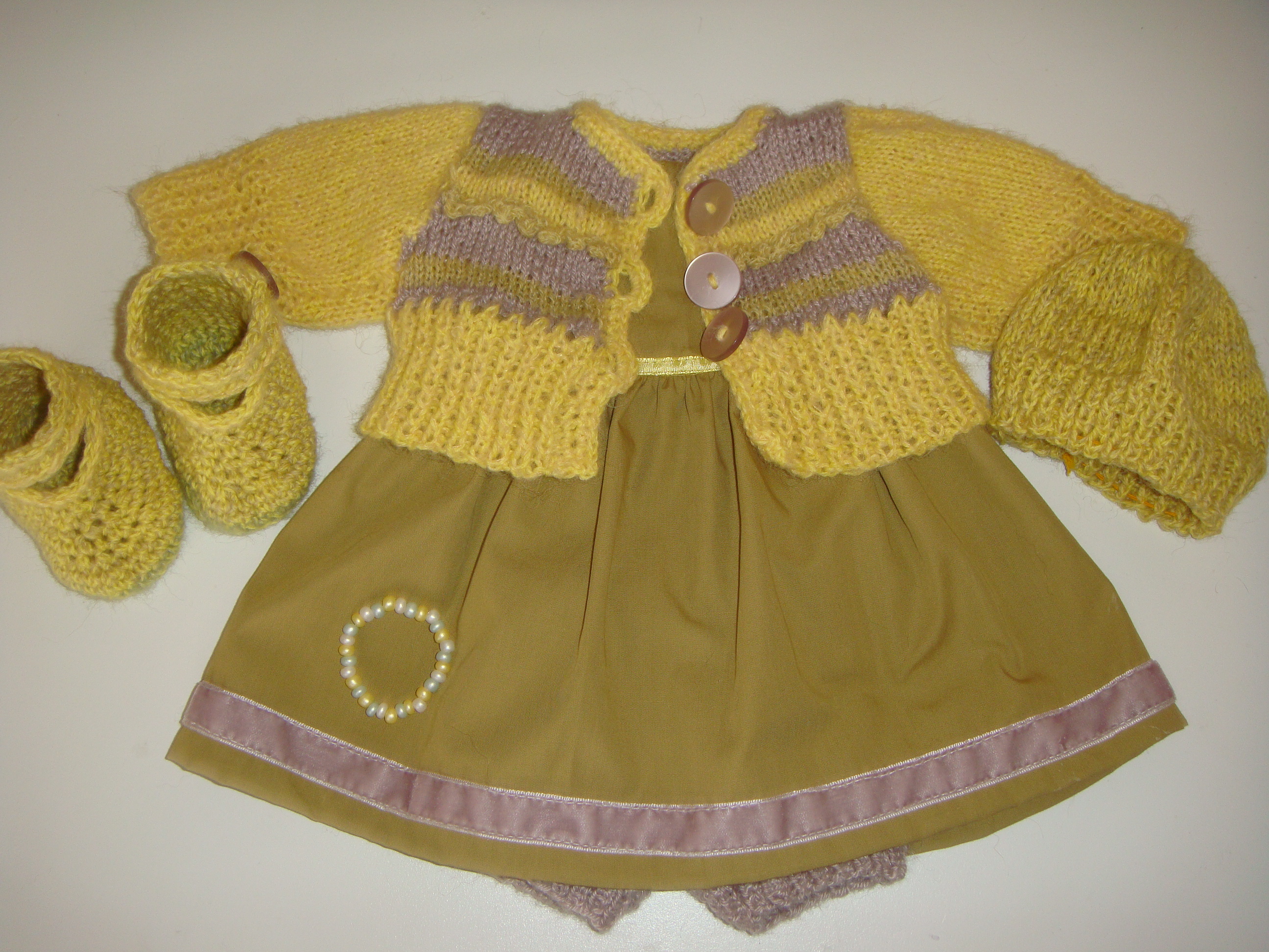 Kjolesæt Lise Sofie Garde Dukketøj, Str. 38 cm 29. marts 202613. april 2026 Kjolesæt bestående af lys karryfarvet økologisk bomuldskjole kantet med lyngfarvet fløjlsbånd. Med følger en strikket cardigan med poseærmer i gul og lyngfarvede nuancer, en hue, strikkede underbukser og hæklede sko. Kvalitet: Ren uld. Relateret