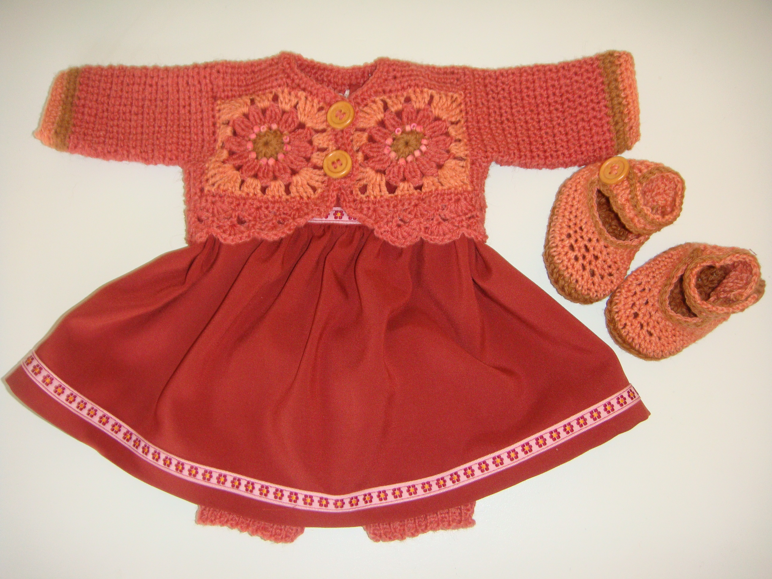 Kjolesæt Lise Sofie Garde Dukketøj, Str. 42 cm 4. april 20264. april 2026 Kjolesæt bestående af rustfarvet viskose kjole med lynlås i ryggen, tilhørende hæklet jakke medoldemorsfirkanter, små hæklede sko og strikkede underbukser Relateret