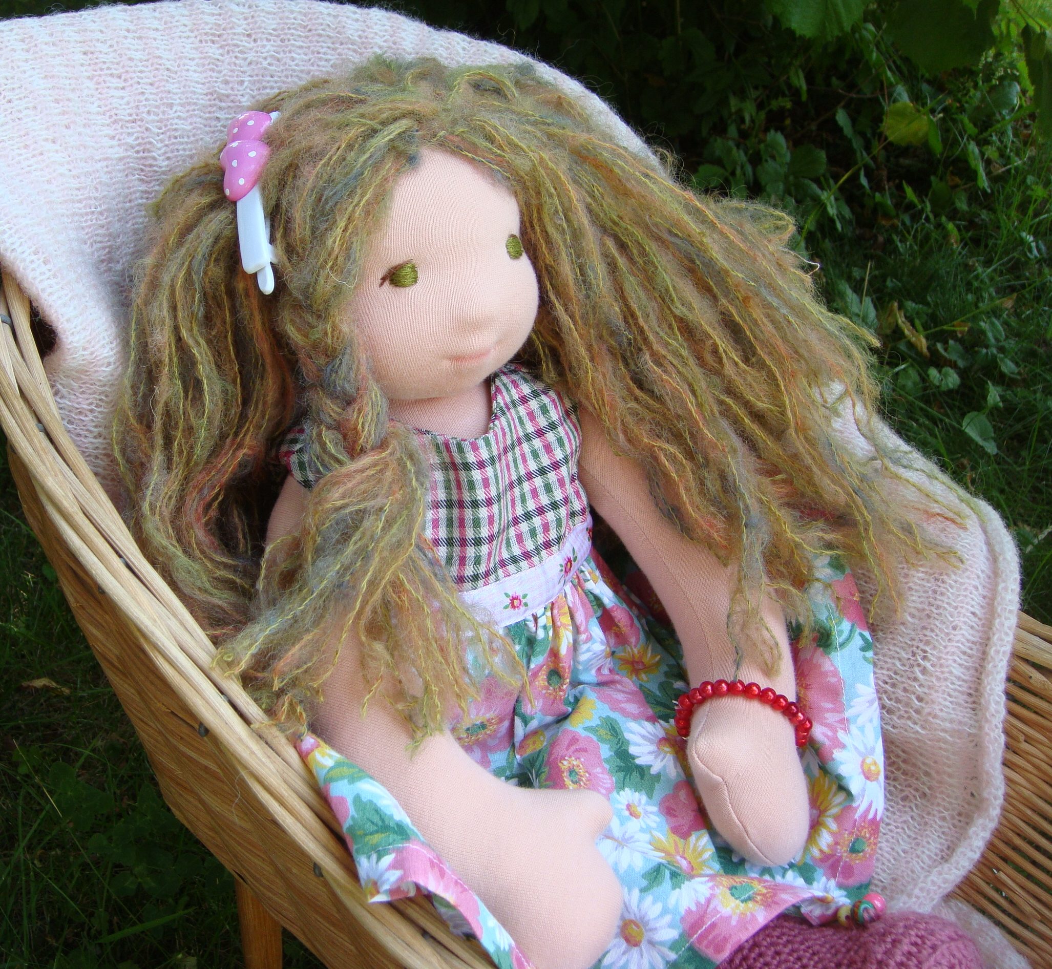 Petruska med grønbrune øjne og gyldent mohair hår. Hun har her sin bomuldskjole på med blomstret nederdel, ternet overdel og en lille lomme. over sig har hun en strikket trøje i gammelrosa, under kjolen rosa hotpants og på fødderne hæklede støvler med små perler på